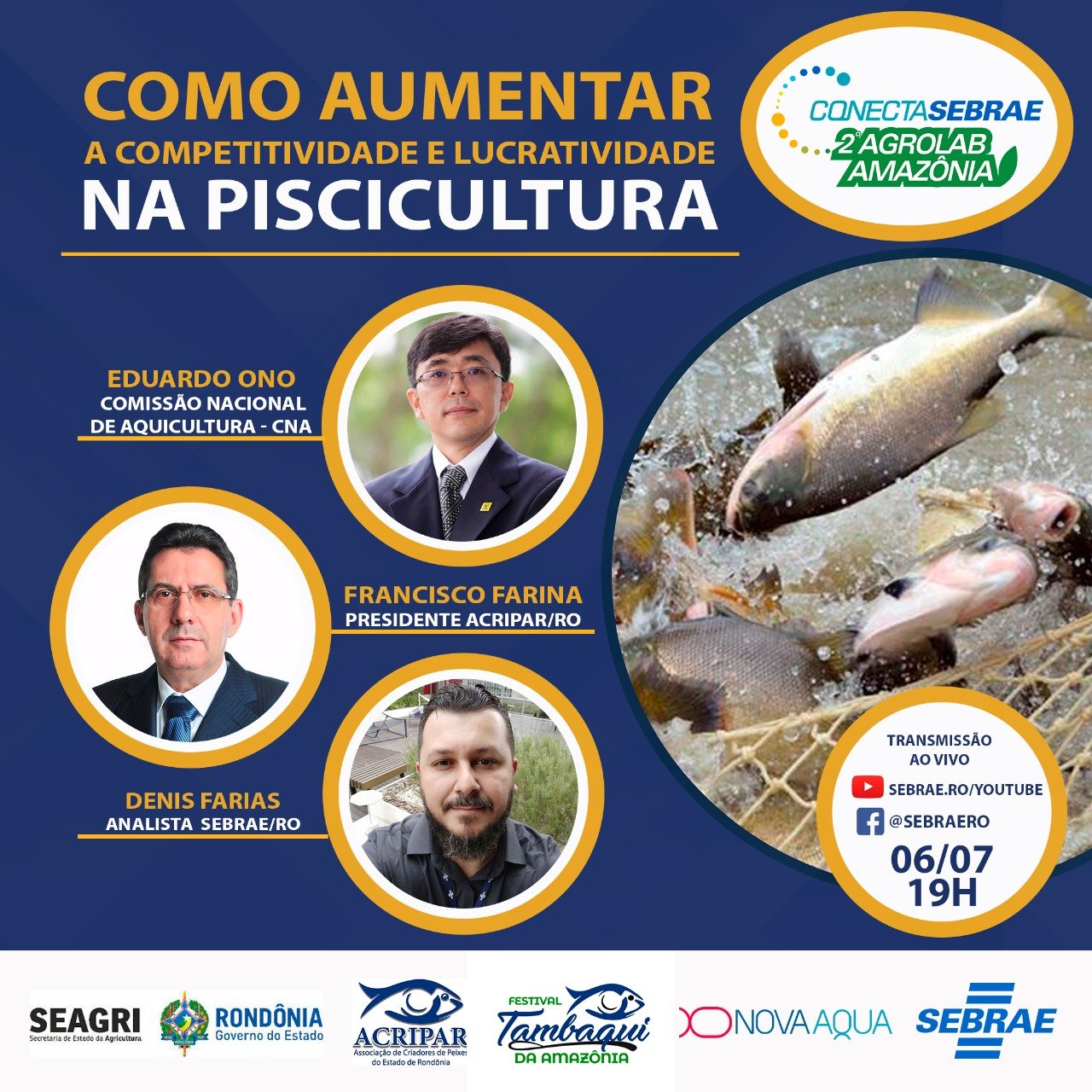 O Sebrae em Rondônia realiza na próxima terça (6/07), às 19h, o evento on line “Como aumentar a produtividade e competitividade na piscicultura”. O evento será transmitido no canal do YouTube do Sebrae em Rondônia e na Fan Page do Facebook da instituição.