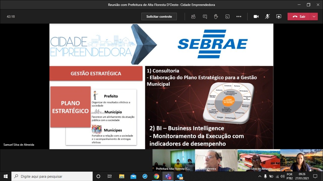 Os diretores do Sebrae em Rondônia, superintende Daniel Pereira e técnico Samuel Almeida, se reuniram, nessa quarta-feira, 27 de janeiro, através de vídeo conferência, com o prefeito de Alta Floresta D’Oeste Giovan Damo e vice Robson Ugolini e sua equipe formada pelo Secretário de Agricultura, Lenoir, Diretor de Assuntos Agropecuários, Marcos Antonio; Secretária Adjunta da Educação, Vania Moreira e chefe de Gabinete, Walmir Étori, para apresentar o programa Cidade Empreendedora, uma iniciativa do Sebrae que integra gestão pública e pequenos negócios em um ambiente de oportunidades para estimular a economia e o desenvolvimento do município.