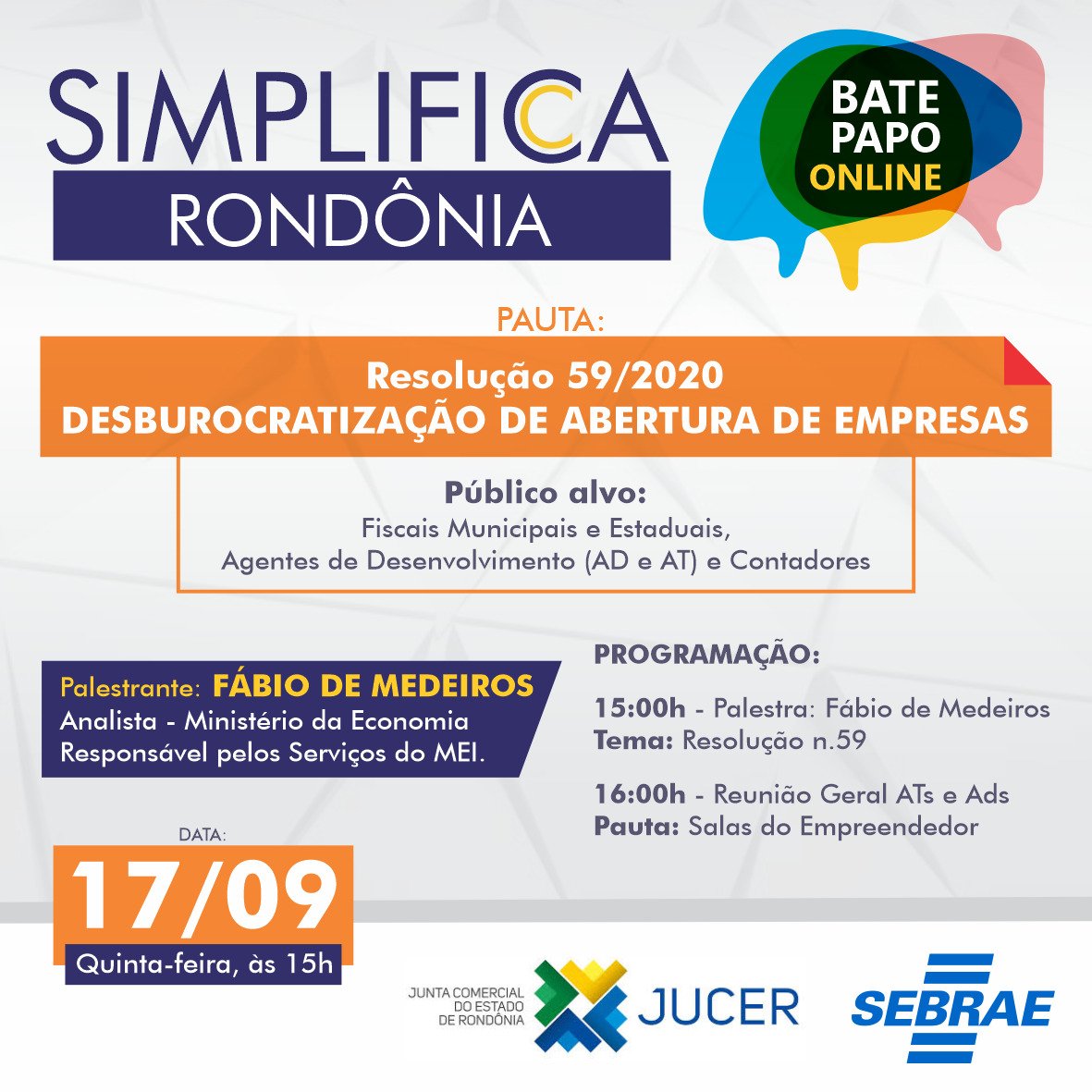 O Sebrae em Rondônia em parceria com a Junta Comercial de Rondônia (Jucer), realiza no dia 17 de setembro, às 15h, a palestra virtual “Simplifica Rondônia”, bate-papo online para abordar uma tema muito importante: a desburocratização no momento da formalização de empresas, com foco na Resolução nº 59/2020 do Comitê para Gestão da Rede Nacional para Simplificação do Registro e da Legalização de Empresas e Negócios (CGSM), que dispensa alvará para o Microempreendedor Individual (MEI), será apresentado pelo palestrante Fábio de Medeiros, analista do Ministério da Economia e responsável pelos Serviços do MEI. O evento tem como público-alvo fiscais municipais e estaduais, Agentes de Desenvolvimento, Atendentes das Salas do Empreendedor e Contadores e será transmitido no canal do YouTube oficial do Sebrae em Rondônia.