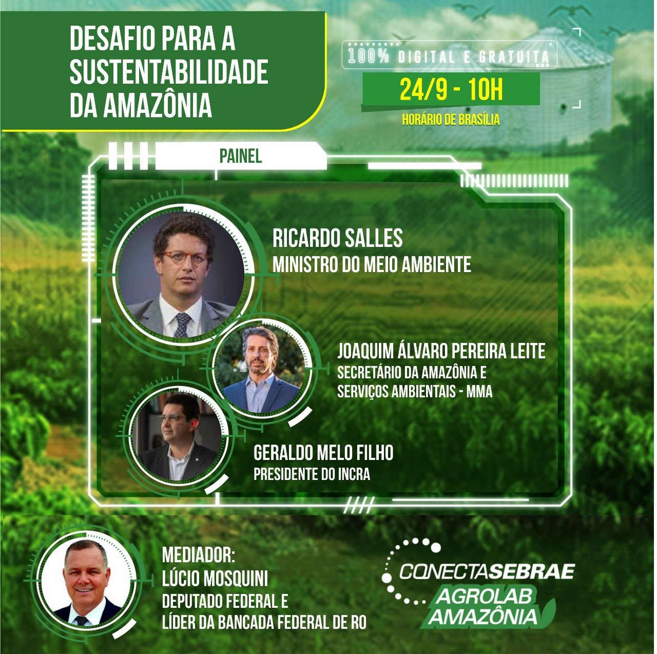 Entre as atrações deste último dia de evento está o painel “Desafios para a sustentabilidade da Amazônia”, com participação do Ministro do Meio Ambiente Ricardo Sales, debatendo o tema com os convidados Joaquim Álvaro Pereira, seu Secretário de Florestas e Desenvolvimento Sustentável, Geraldo Melo Filho, presidente do Incra e tendo como moderador do painel, o Deputado Federal por Rondônia, Lucio Mosquini.