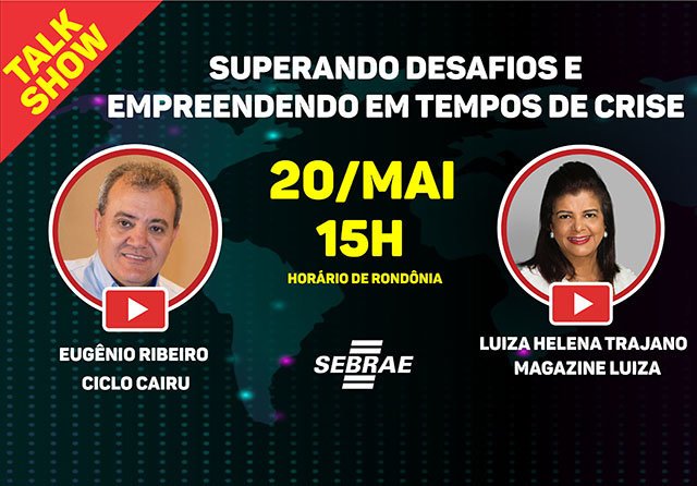 Nesta quarta-feira (20), às 15h, o Sebrae apresentará o Talk Show Superando desafios e empreendendo em tempos de crise com a perspectiva do empreendedorismo. Os convidados serão Luiza Helena Trajano, do Magazine Luiza, uma das mais conceituadas marcas do mercado e Eugênio Ribeiro, da Ciclo Cairu, uma das maiores fábricas de bicicletas do Brasil.