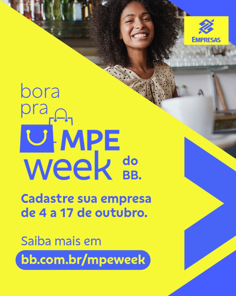 Realizada pelo Banco do Brasil, pelo terceiro ano consecutivo, a MPE Week. O projeto consolida a parceria com o público micro e pequena empresa (MPE), que representa 54% dos empregos com carteira assinada e 27% do PIB brasileiro, de acordo com dados do Sebrae. São 18,6 milhões de MPE no Brasil, sendo que 12,7% são clientes BB.