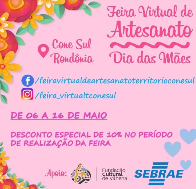 Para Cristiane Arruda, analista do Sebrae, “O dia das mães sempre resultou em um ótimo período para venda de artesanato, afinal presentear com algo feito manualmente e com muito carinho é uma excelente opção. Mas esse ano as coisas estão diferentes e, por esta razão, junto com as artesãs decidimos realizar a feira. Estamos com uma equipe que reúne um grupo de 51 expositores, com grande diversidade de produtos e com representantes de todo Cone Sul do estado de Rondônia e pode ser acessada pelo Facebook em Feira Virtual de Artesanato Território Conesul de Rondônia ou no Instagram Feira virtualtconesul”, completa Cristiane.