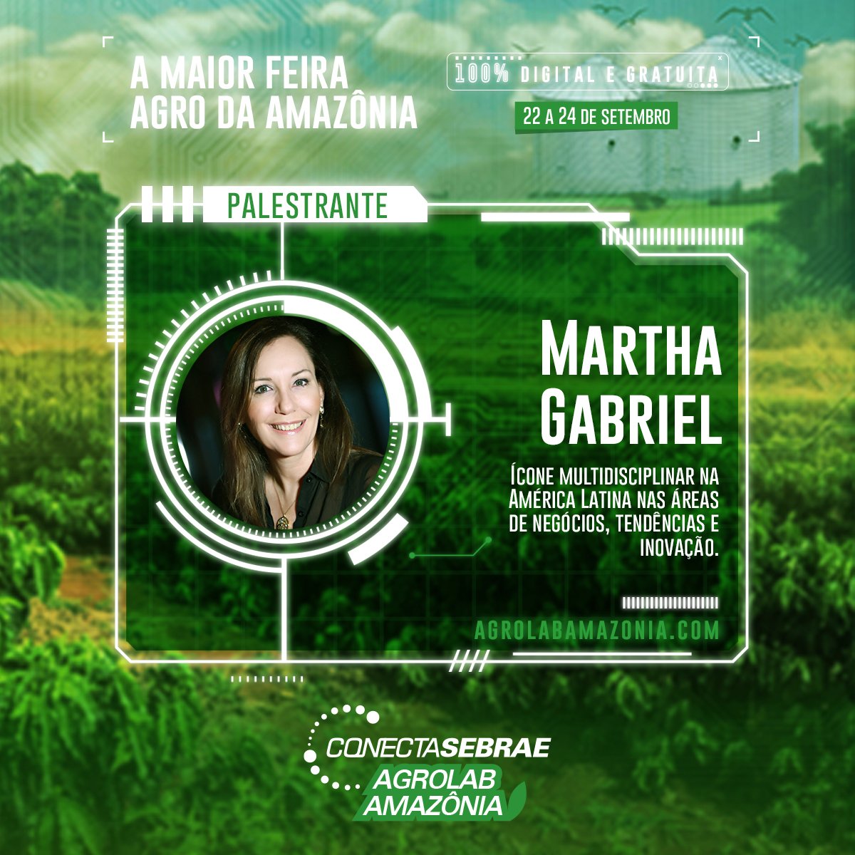 Martha Gabriel é engenheira, pós graduada em marketing, mestre em artes e formação executiva, além de futurista, consultora e palestrante, focada em temas de Inovação e Tecnologia, autora de livros como “Você, eu e os robôs”, que ajudam a visualizar como podemos introduzir soluções que potencializem desempenhos e resultados. Martha é uma grande referência em prever tendências que irão alavancar os negócios nos próximos anos, o que faz de sua palestra online durante a Agrolab Amazônia algo imperdível.