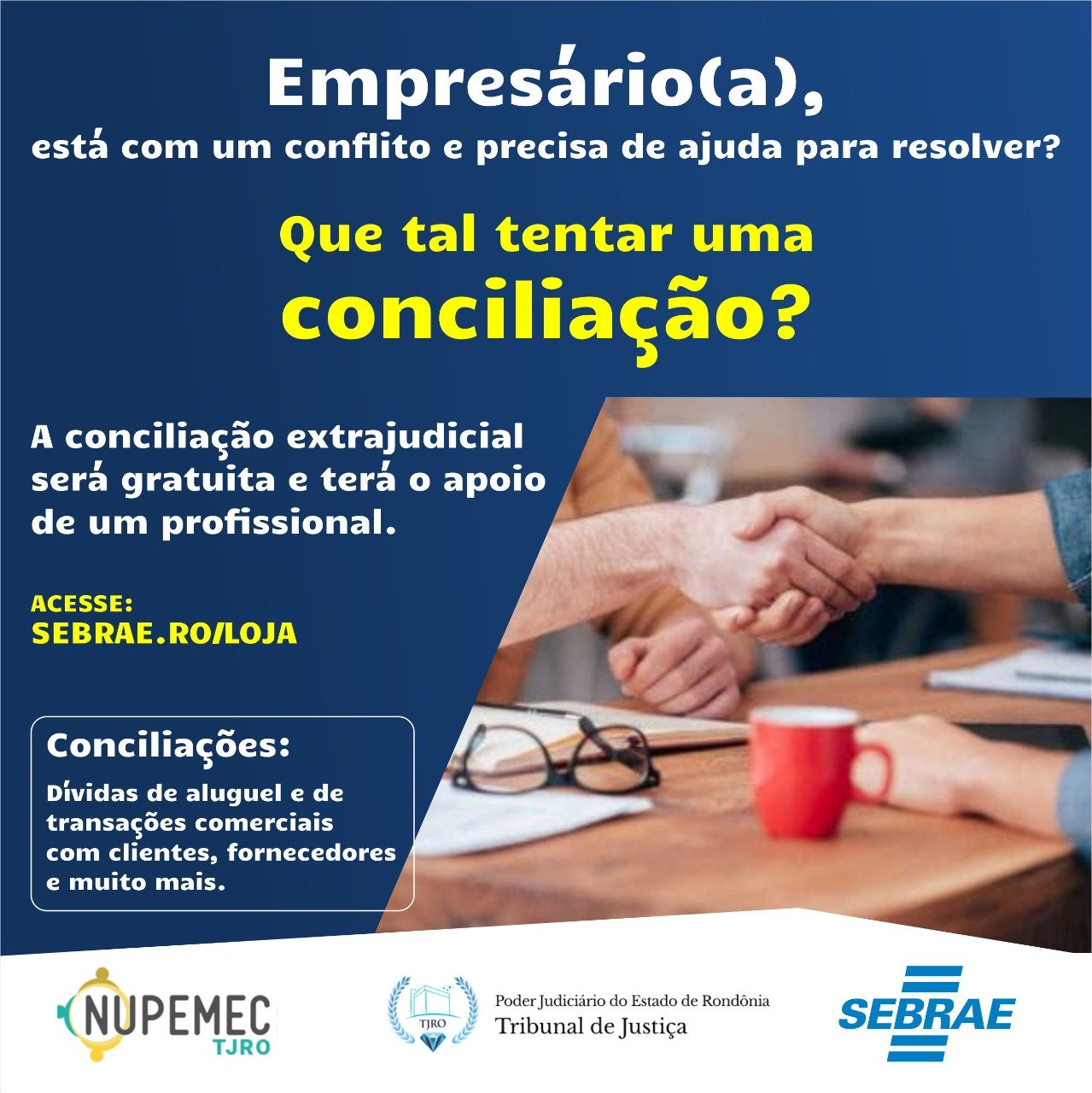 Por meio de uma parceria entre o Serviço de Apoio às Micro e Pequenas Empresas em Rondônia (Sebrae) e o Tribunal de Justiça de Rondônia, representado pelo Núcleo Permanente de Métodos Consensuais de Soluções de Conflitos (Nepumec), órgão integrante do judiciário, foi firmado nesta semana (19), um termo de cooperação técnica que tem por objetivo disponibilizar conciliadores para auxiliarem empresas, fornecedores e consumidores de Rondônia a resolverem controvérsias por meio de audiências conciliatórias. Os empresários poderão solicitar o apoio do conciliador por meio digital.