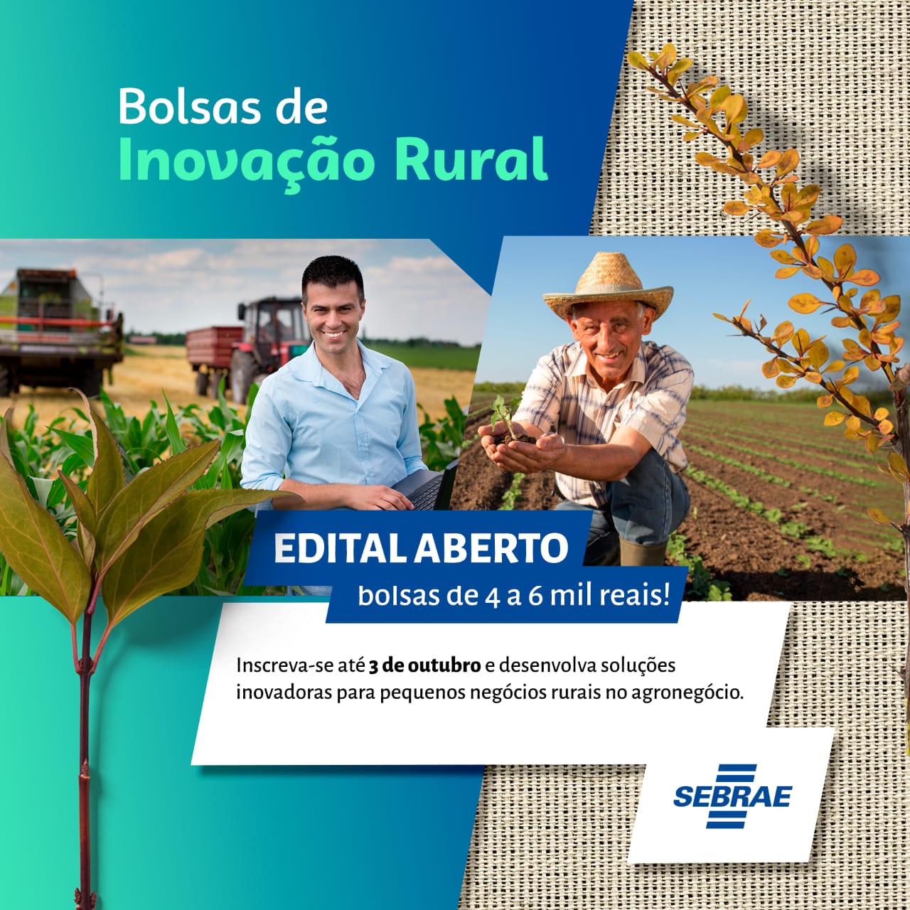 O Sebrae mais uma vez promove a cultura da inovação, desta vez com foco no agro. Estão abertas as inscrições para seleção de bolsistas de estímulo à inovação para atuar no Projeto Inovação Rural – Bolsas de Extensão Tecnológica do Sebrae.