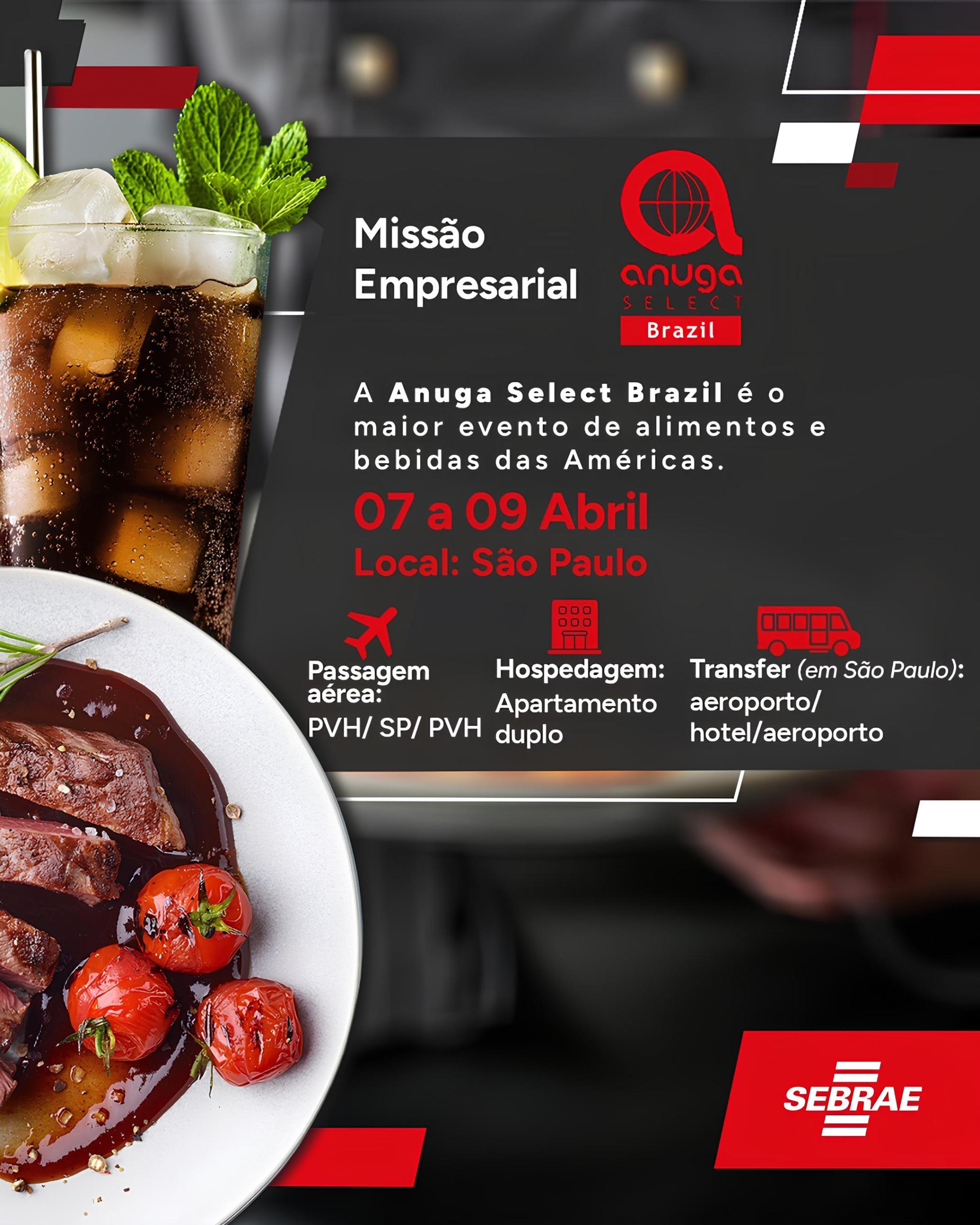 Sebrae em Rondônia, por meio da regional de Ariquemes, está com inscrições abertas para a Missão Empresarial que levará empreendedores à ANUGA Select Brazil 2026, que será realizada em São Paulo.