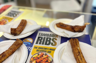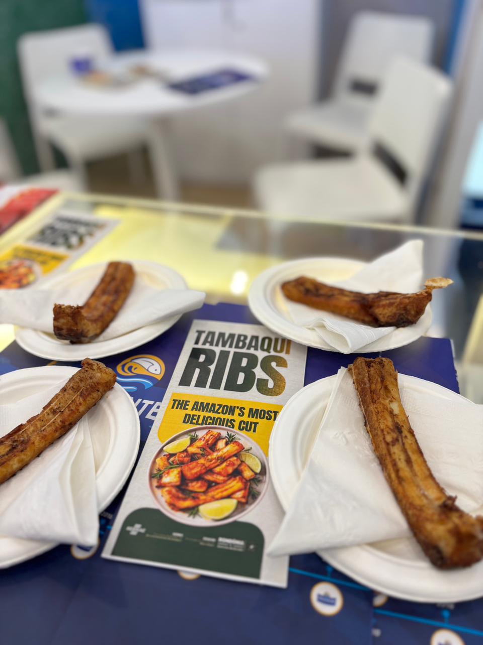 Durante o evento, visitantes têm a oportunidade de conhecer o produto de forma prática: costelinhas de tambaqui são servidas para degustação no estande, estratégia que valoriza o sabor e a qualidade do peixe amazônico.